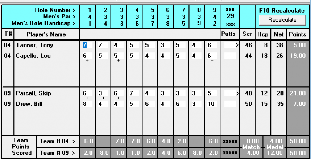 John / Yvan played Dan/Gary really tough for 7 holes but holes 8 and 9 gave Dan/Gary 12 of their 14 point win. John continues to post numbers playing the A slot scoring a 47 net 29 to top Dan’s somewhat off 42 net 34. Gary’s comeback from the depths of handicap heck continues – his 39 net 28 insures that his 11 handicap probably won’t be on the scorecard next week.Zach/Justin were down a bit after losing holes 2 and 3 but then won or tied the final 6 holes and ultimately took a 20 point victoryKen/James took whatever spark the Hull’s brought to the first tee by winning the first three holes — only Mitch’ par on the 3rd hole avoided a 24-0 sweep… Mitch and Larry fought back winning the next two holes but Ken/James put the match away over the last 4 holes winning 3 and tying 1 – welcome to 2nd place Ken/James… “The Giant Killers” fought Skip and the Nick Malaxos Sandbagger of the Year leading candidate Bill to a 50-50 dead draw. Skip posted a fine 40 net 28 that only a couple of blemishes prevented a “round of the year” effort from being posted… Lou launched his own Nick Malaxos Sandbagger of the Year candidacy with the best net round of the week …. a 44 net 26 … no pars, 3 bogies, 6 double bogies… Congratulations Lou, you’re a 17 handicap now!Holes 3,4,5,6 proved crucial in Dustin/Casey big win over Lenny/Peter… Casey’s hdcp strokes on 3 and 4 turned close holes into winning holes, then Dustin’s birdie on 5 offset Lenny’s par… both Dustin and Casey parred hole 6 and the die was cast and the match was won… Lenny/Peter fought back on 7,8 but Dustin/Casey swept that comeback away with a straight up 8-0 win on the 9th.Ron/Kenny played the league leaders tough, all even after 3 holes, but dropped the next 3 holes 23-1 so their 17-7 comeback on the final 3 holes ultimately fell short. Kenny drops another stroke next week after posting a fine 45 net 31The “Super Seniors” Brian/Harry posted fine scores net 33 and 31 respectively but both Mike and Jonathan responded in kind with net 28 / 27 sweeping all of the Match and Medal points and starting on hole 4 swept the first 6 holes of the match… this was a well played and very close match not at all reflected in the final score.