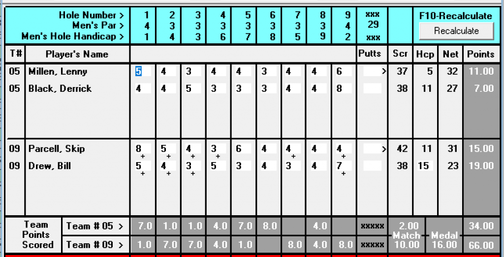 a big win for John / Yvan – both broke net par for the first time this season… maybe it was the morning heat and sunshine? First hole jitters kept the winning team from putting together a pair of Nick Malaxos Sandbagger of the year worthy rounds…DanO/Gary played an outstanding (read “get ready to give back a handicap stroke”) matches both breaking net par – Zac never posted a dreaded “other” but 4 double bogies cost him, and the team, dearly Ken vs Russ was a back and forth match much closer than the 18-8 score indicated… holes 5 and 8 proved decisive in tilting the match to team 11… a reminder: if you are late e.g. teeing off after 430 PM we need to reach out to our opponents AS SOON AS POSSIBLE…The “Giant Killers” started off quick, winning 3 of the first 4 holes and took a 23-9 points lead but Mitch went +3 over the last 5 holes to pull away and Larry only dropped the 8th hole to Lou over the final 6 holes resulting in a resounding victory for team Hull.Lenny/Derek played fine golf posting a combined +1 net but got knocked down a peg or two by both Skip (who shot a fine 42 net 31 to edge Lenny by a stroke) and leading Nick Malaxos Sandbagger of the Year candidate (why not just award it now) Bill Drew who in true Nick fashion mixed in a scorching 38 net 23 as opposed to his handicap boosting 50 from last week… Hot or Cold, which will he be next week?Please give Ron your best wishes – he thought he “threw out his back” after his tee shot on 9 last week; turns out he was having a serious cardiac event… Get well soon, Ron!!! Aarne Lofgren stepped into the breach and while Dustin breathed a sigh of relief over getting 2 strokes versus giving 4… but Aarne stepped on the gas right from the get-go … he was +1 going into the 9th hole and ended up 2 under par Net… Dustin’s fine 38 net 30 only earned him 6 points… Casey didn’t fare much better as Kenny J shot a fine 43 net 30 resulting in an overwhelming 73-27 result.1st place Jamie/Chris had a really competitive match with Mike/Jonathan … team 7 pulled ahead with an 8-0 win on the 3rd hole but lost the match on holes 4 and 5 dropping both holes by 7-1 margins… both teams either pushed 4-4 holes or alternated 7-1 wins/losses resulting in a 60-40 win for team 14…